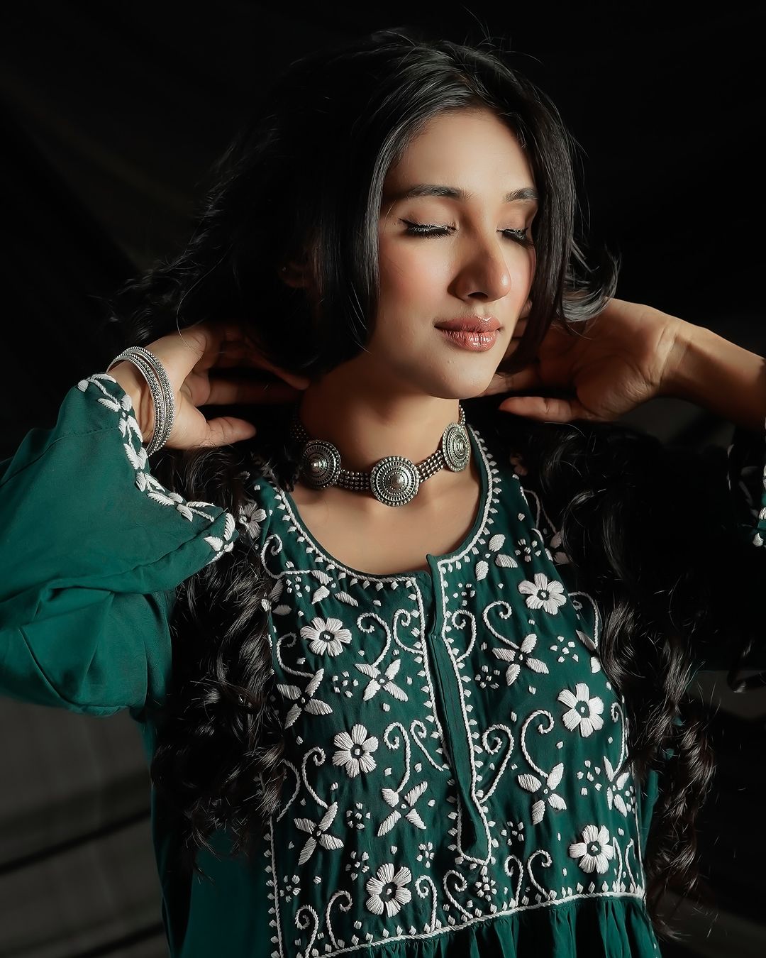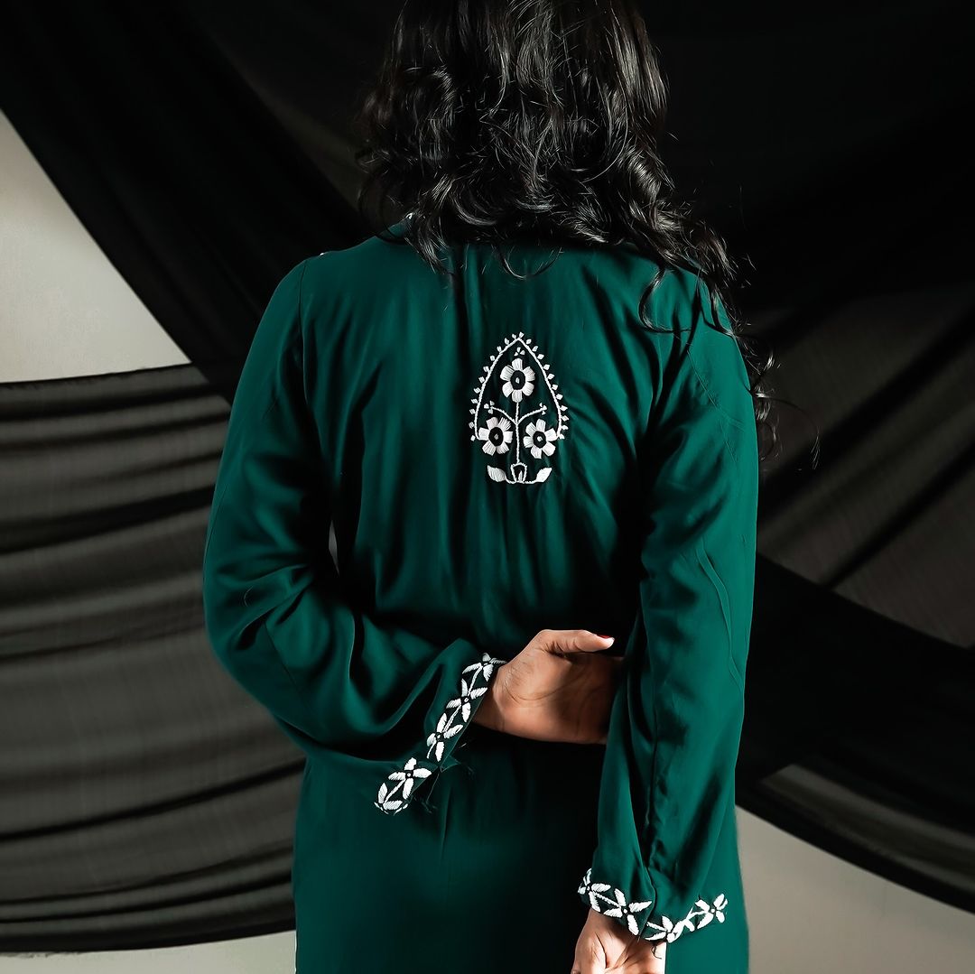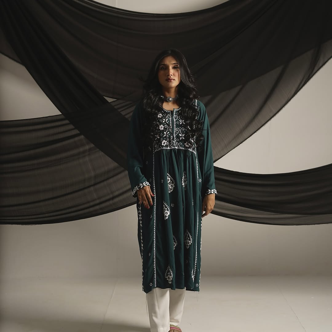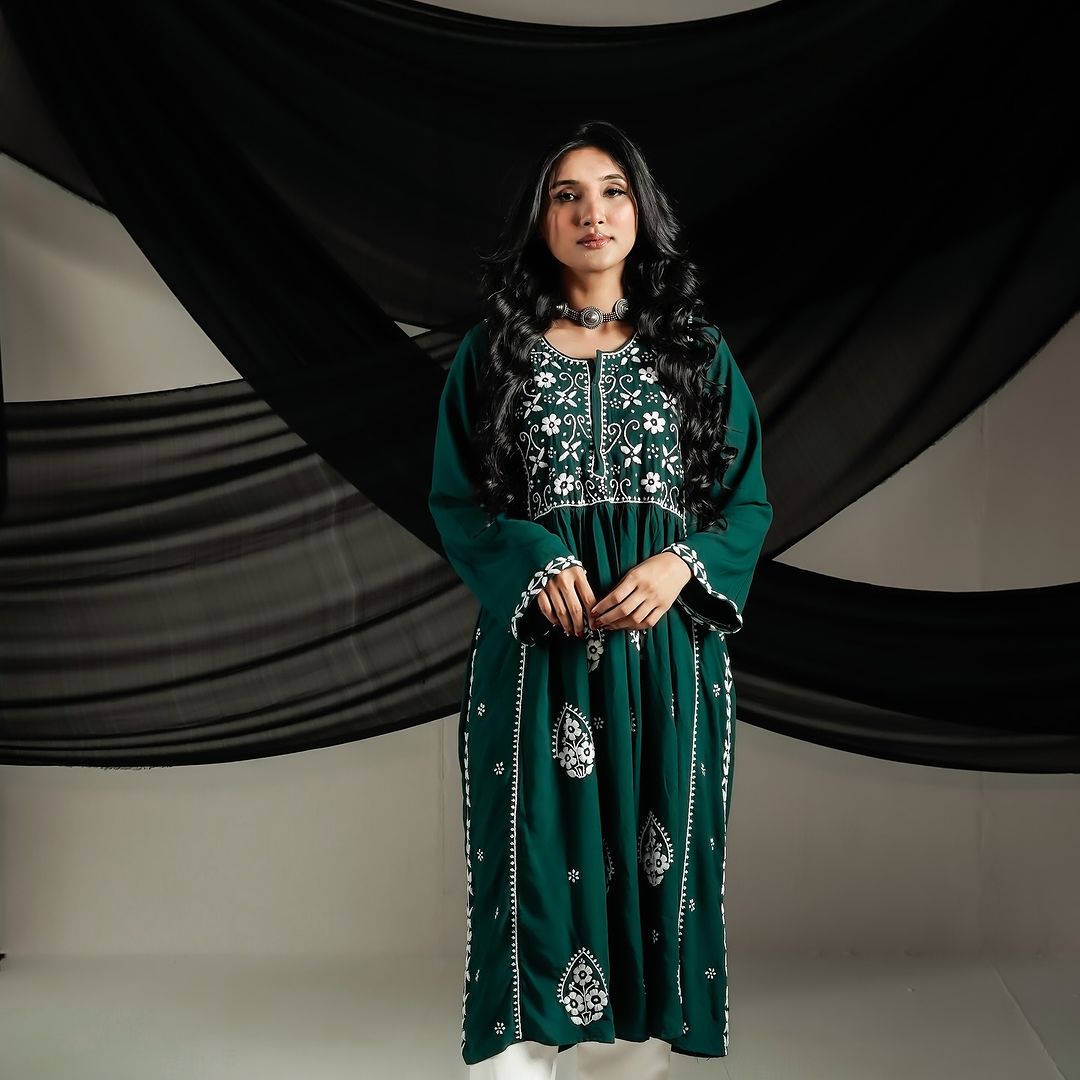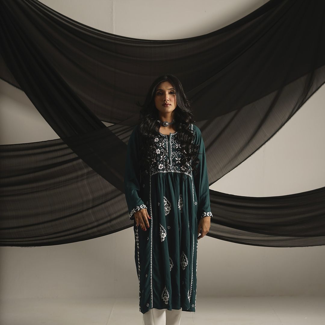 Our Indian Lucknowi kurti is adorned with signature series white Chikankari embroidery throughout the shirt, enhanced by beautiful borders on the side seams, daman, sleeves, and back.